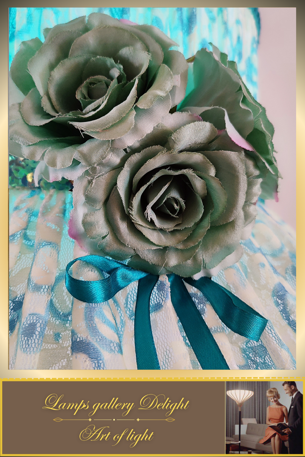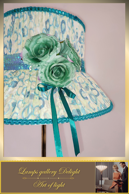 Floor lamp with a fabric lampshade of milky turquoise color in the form of a hat. The metal base of the floor lamp is bronze. The lampshade is a strong metal frame covered with guipure and decorated with flowers and sequins. It glows very well with any type of lamp, looks fabulous when using RGB smart bulbs, emits incredible colors and shades)))
